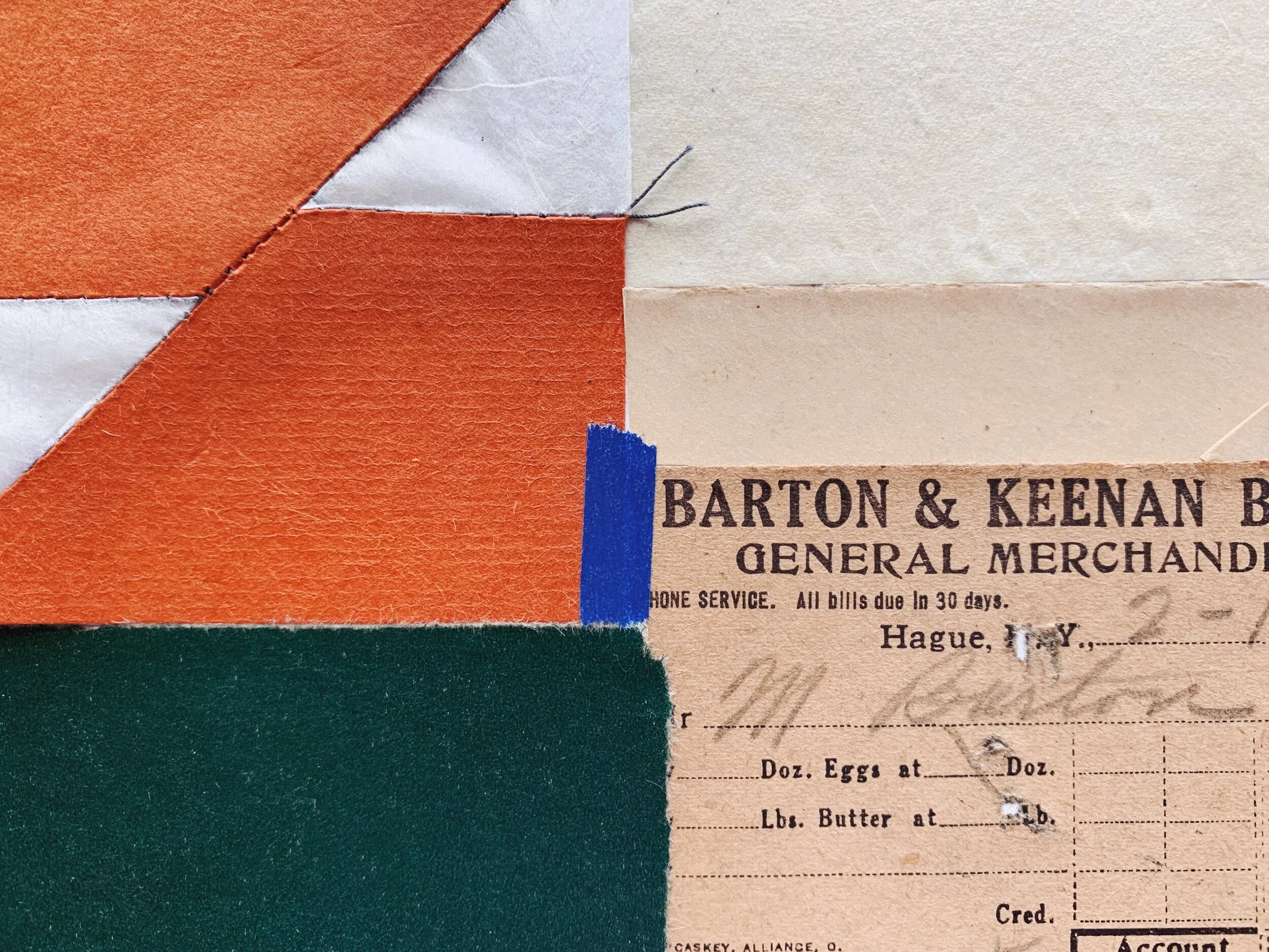 I, 8.5” x 11”—found paper, thread, washi tape, graphite